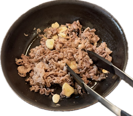 8.フライパンに和牛を投入引き続き弱火で赤身が無くなる程度炒めます。