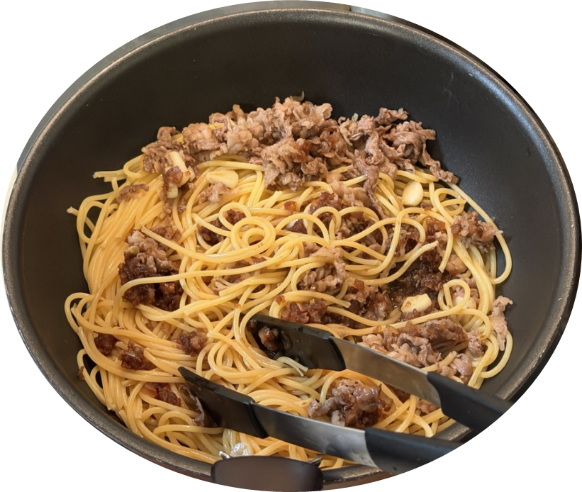 13.ゆであがったパスタをフライパンに投入して、和牛とソースを投入。